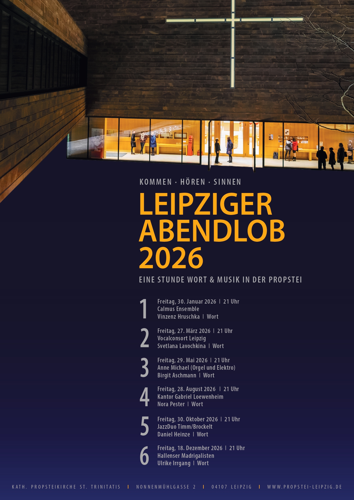 Eine Jahresübersicht zum Leipziger Abendlob 2026 kann über die Internetseite www.propsteimusik-leipzig.de abgerufen werden oder liegt als Flyer anbei sowie im Foyer der Propsteikirche bereit.
